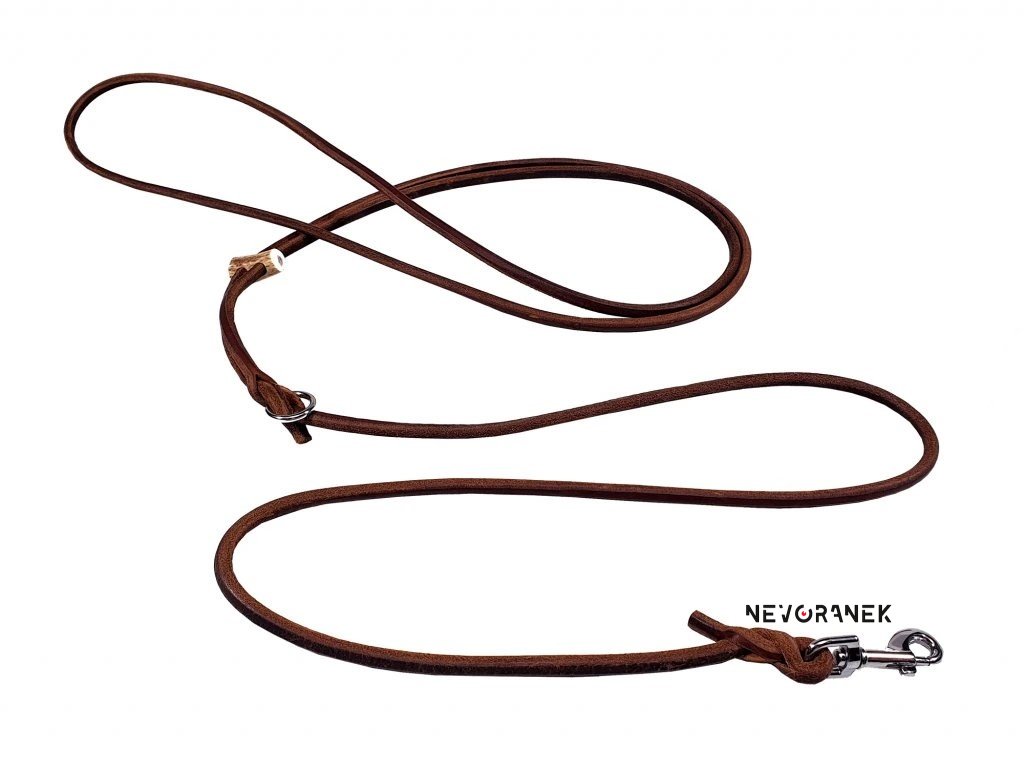 Vodítko je vyrobeno z pevné maštěné kulaté kůže. Spoje jsou jak u klešťové karabiny tak v části přes tělo napevno propleteny.
