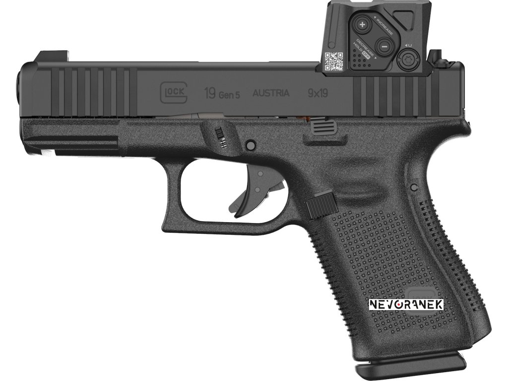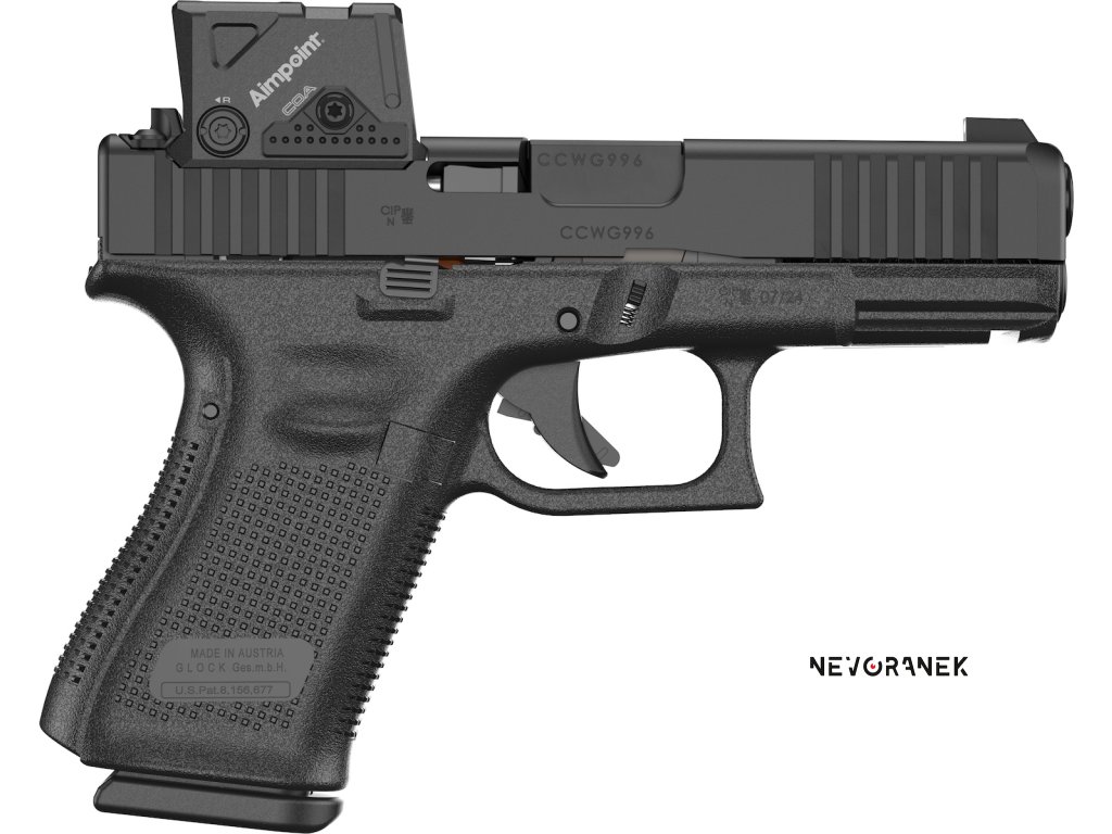 Glock 19 Gen5 A-CUT je pistole velikosti COMPACT v ráži 9 mm Luger v konfiguraci s kolimátorem Aimpoint COA, se závěrem s modulárním optickým systémem konstruovaným pro kolimátor Aimpoint COA.