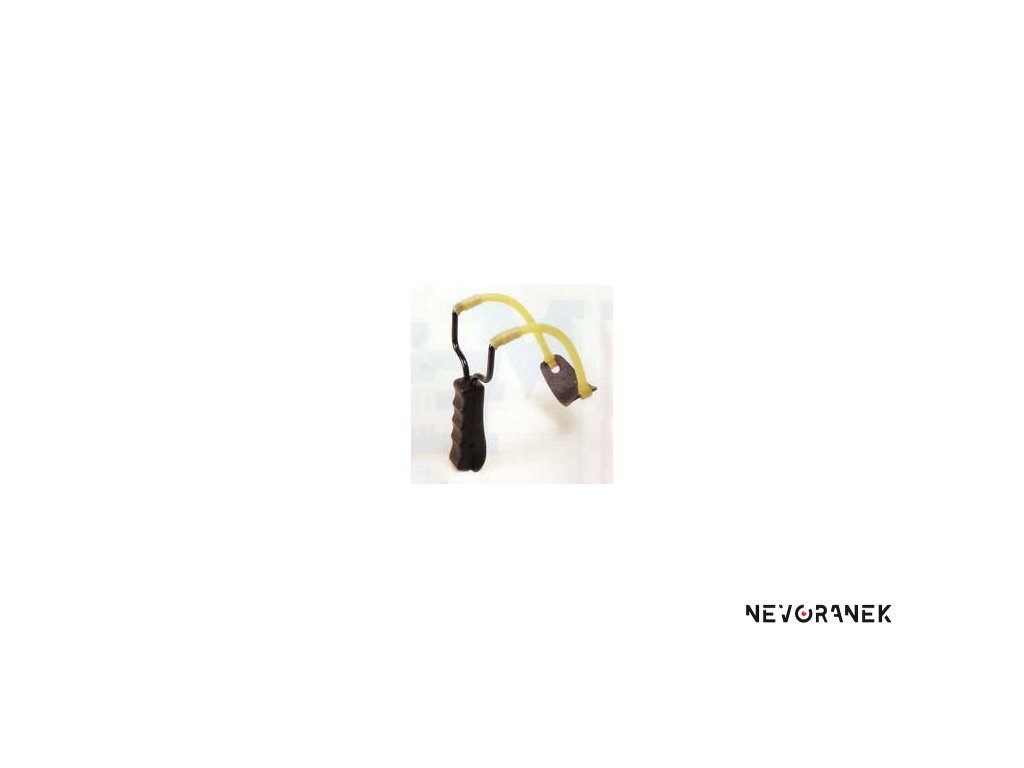 Jednoduchý prak bez opěrky. Plastová rukojeť, vidlice kovové.