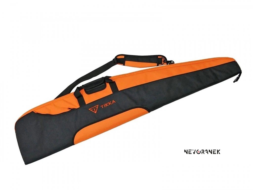 Pouzdro černooranžové barvy a oranžově vyšitým logem Tikka. Pouzdro má jednu hlavní kapsu na zbraň a z vnější strany jednu menší kapsičku na zip.