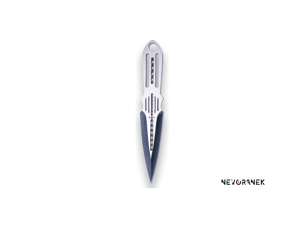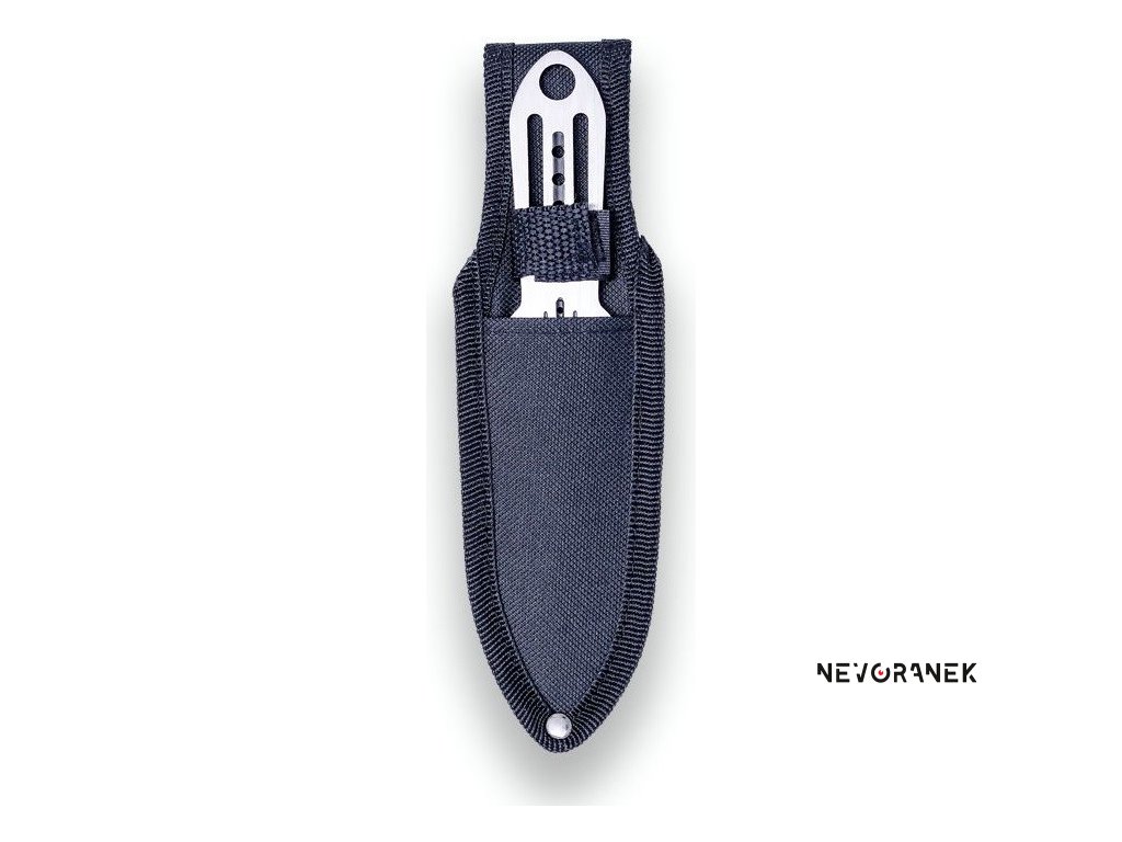 Nerezový vrhací nůž 83g v plochém tvaru s oboustrannou částečně černěnou čepelí vyrobený z jednoho kusu materiálu s odlehčovacími otvory na tvarované střence i čepeli a nylonovým pouzdrem pro upevnění k opasku.