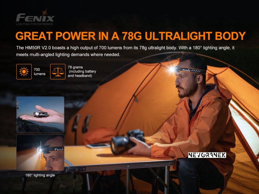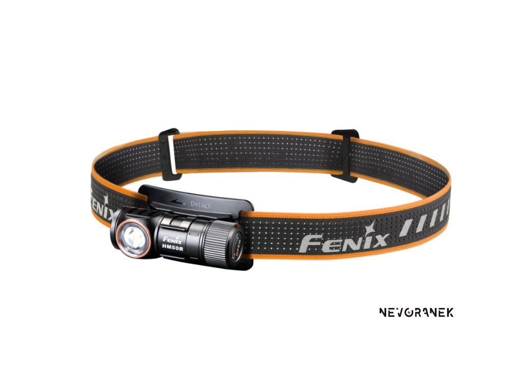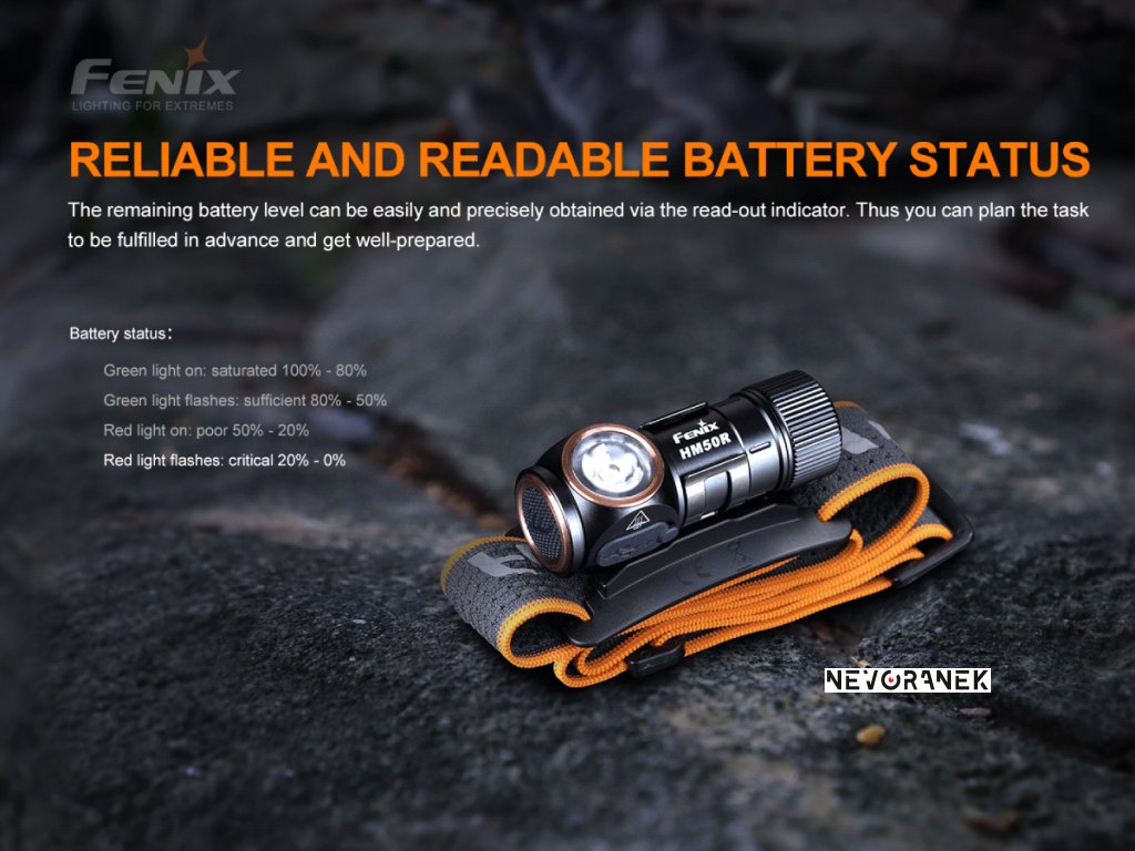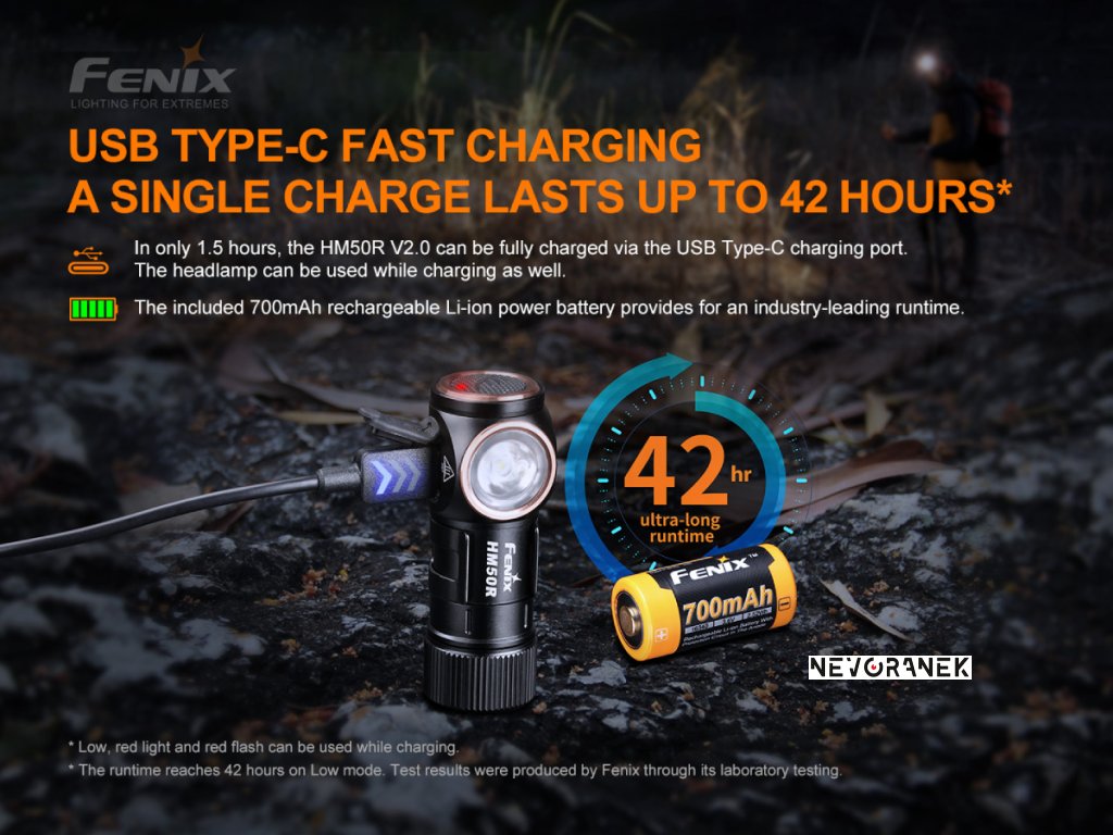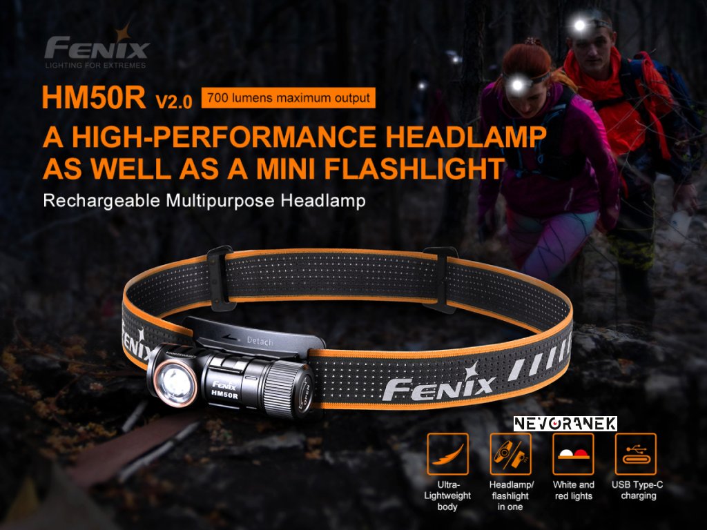 Fenix HM50R V2.0 je druhá generace oblíbené nabíjecí čelovky s výkonem až 700 lumenů, dosvitem 115 metrů a červeným světlem. K napájení lze použít buď Li-ion akumulátor RCR123A (je součástí balení), nebo jednorázovou baterii CR123A (s omezeným max. výkonem na 130 lumenů). Akumulátor RCR123A lze dobíjet přes USB-C konektor přímo v čelovce. Světelným zdrojem je špičková LED Luminus SST-20 s denním odstínem světla (6000 K). V ovládacím tlačítku na boku čelovky je též zabudována indikační dioda, která po stisknutí ukazuje stav nabití baterie.