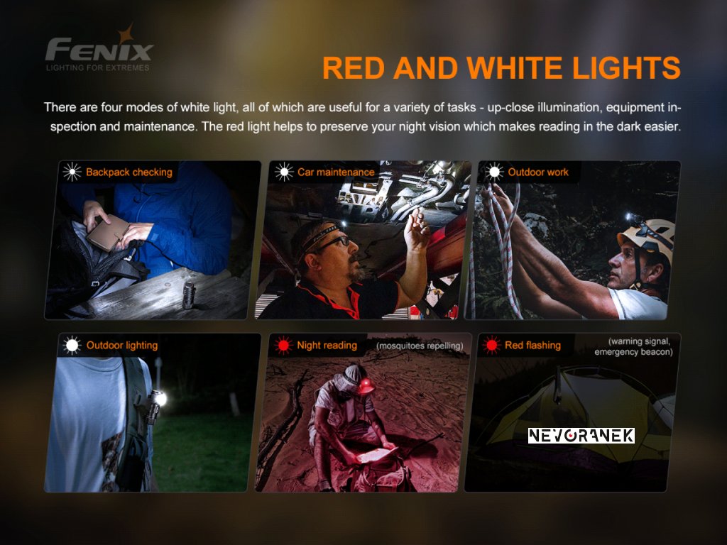 - Dva režimy červeného světla: 5 lumenů (60 hodin) -> červené blikání 5 lumenů (120 hodin).