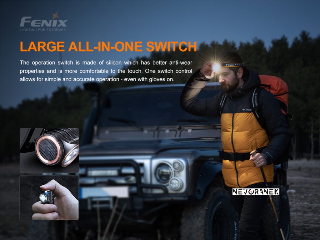 - Pohodlné ovládání jedním elektronickým spínačem na boku čelovky.