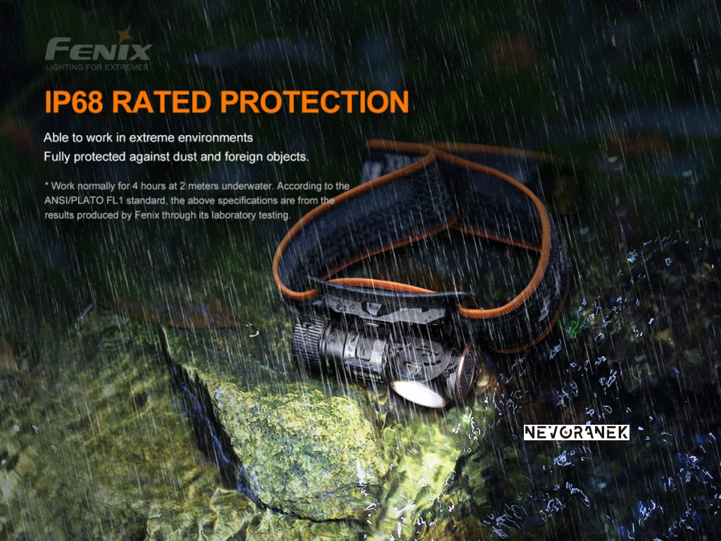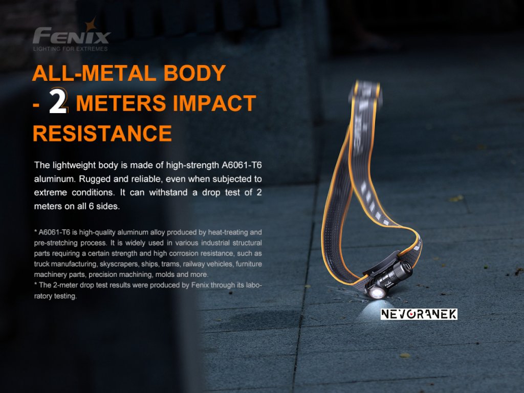 Celokovová konstrukce zajišťuje vysokou odolnost, optimální chlazení a zároveň je plně vodotěsná dle standardu IP68 až do hloubky 2 metry pod vodou. Praktičnost čelovky zvyšuje možnost vyjmout světlo z hlavového držáku a používat ji i jako malou kapesní svítilnu. Čelovka Fenix HM50R V2.0 je ideálním společníkem pro různorodé sportovní aktivity, výlety do přírody i do domácnosti a na práci.