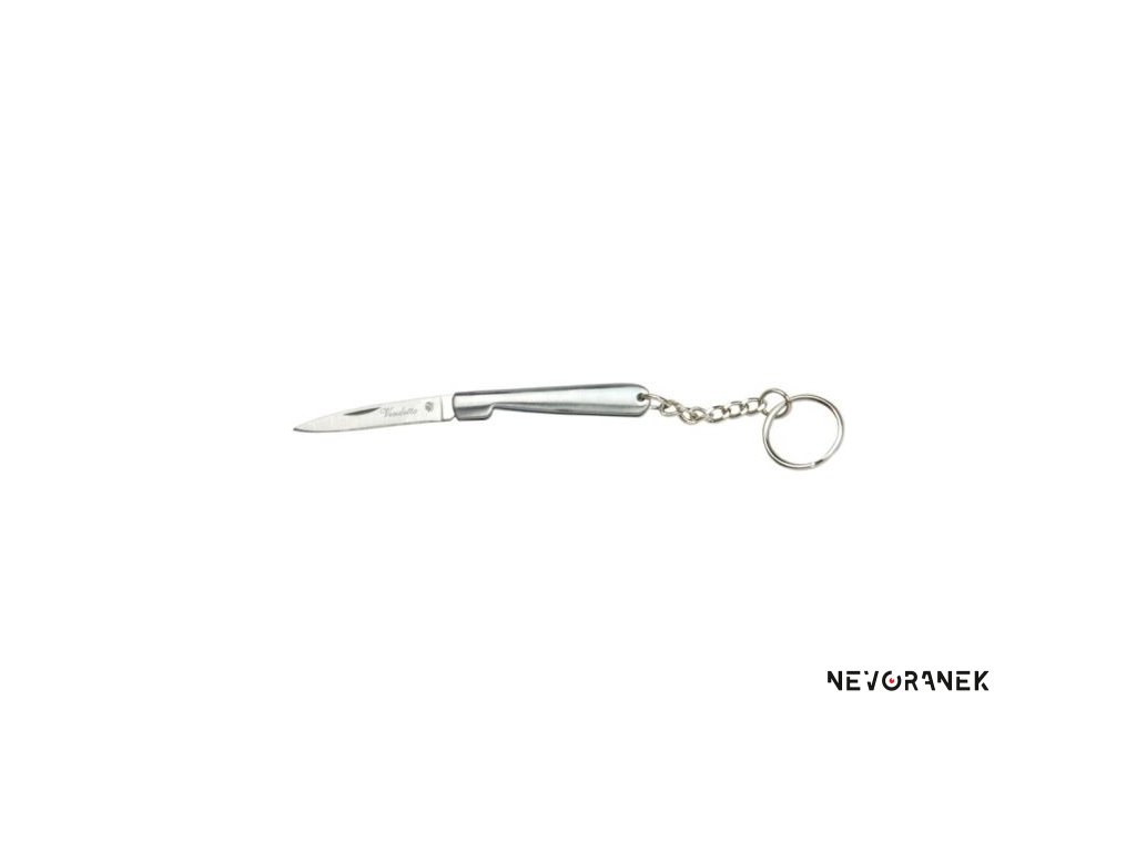 Přívěsek na klíče ve tvaru zavíracího nože s leštěnou střenkou inox, úzkou štíhlou nerezovou čepelí o délce 40mm s nápisem "Vendetta" a řetízkem s kroužkem pro zavěšení.